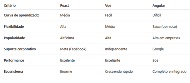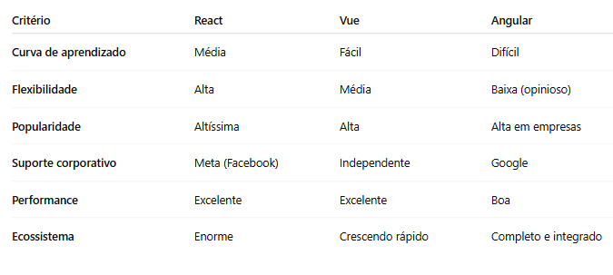 Em 2025, React, Vue e Angular continuam sendo escolhas sólidas para desenvolvimento frontend. Cada um possui pontos fortes e limitações que devem ser considerados com cuidado.